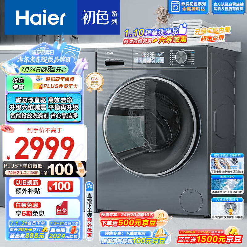 海尔(Haier)滚筒洗衣机全自动单洗 初色超薄 10公斤大容量【直驱EG100BD88PLUS】一级能效 内衣洗 以旧换新价格:2999.00元!