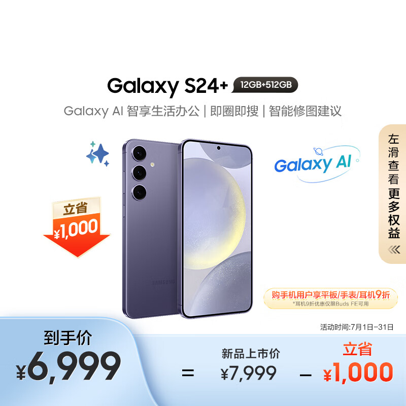 三星(SAMSUNG)Galaxy S24+ AI手机 智享生活办公 5000万像素 拍照手机 第三代骁龙8 游戏手机 12GB+512GB 秘矿紫价格:6999.00元!