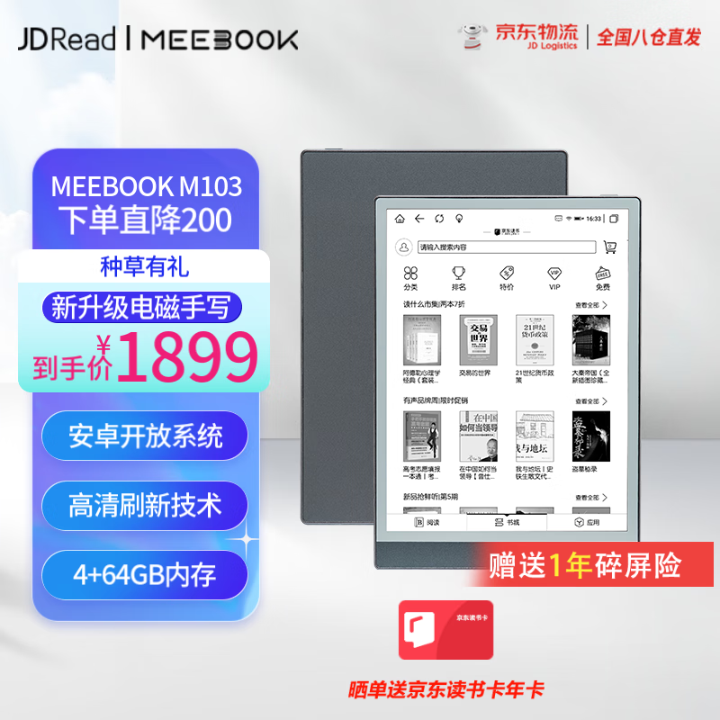 JDReadMEEBOOKM103 10.3英寸高清墨水屏电纸书 电磁笔手写 电子阅读器 高性能阅读器平板4+64G新品发布价格:2150.00元!