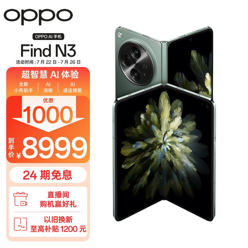 OPPO Find N3 12GB+512GB 千山绿 超光影三主摄 国密认证芯片 哈苏人像 骁龙 5G 拍照AI折叠屏手机价格:8999.00元!