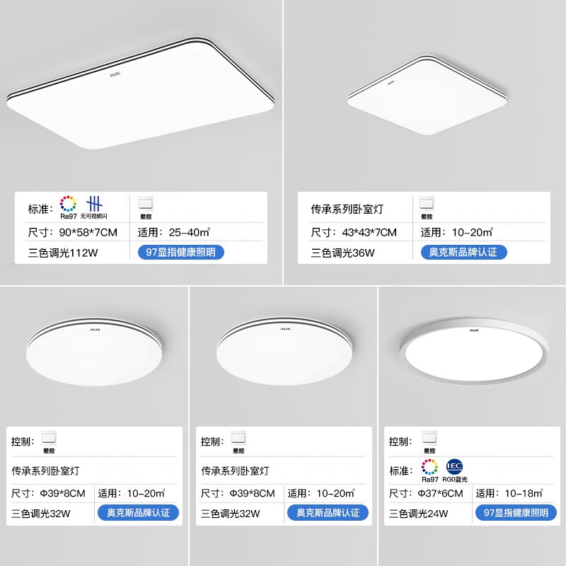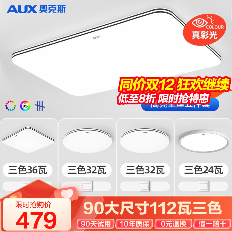 奥克斯(AUX)LED吸顶灯客厅大灯具套餐三室两厅餐厅卧室书房健康照明阳台灯 大客厅三色90cm护眼3室2厅套餐B价格:599.00元!