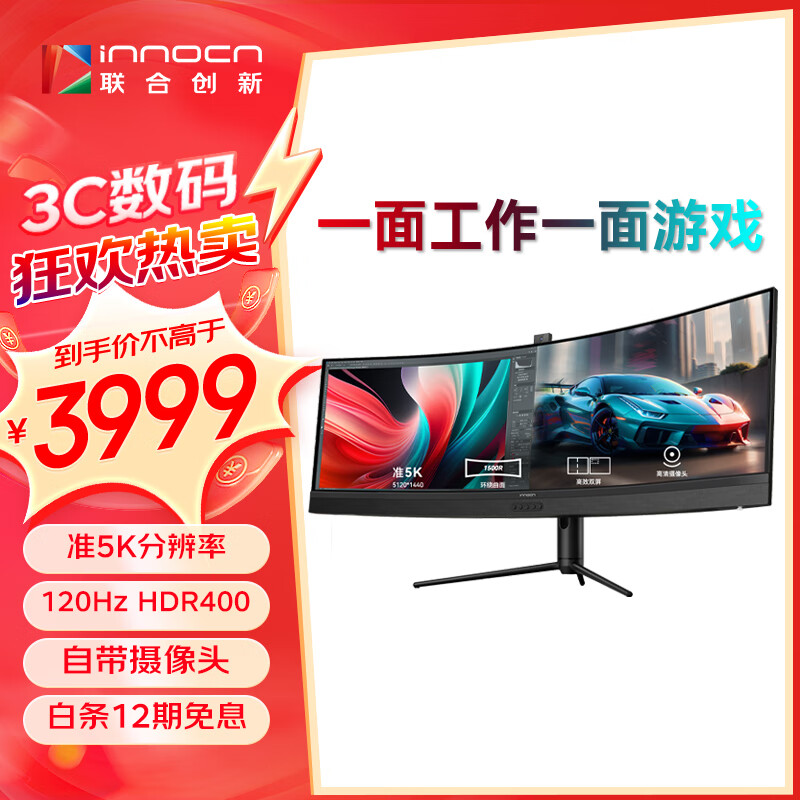 联合创新(Innocn)44.5英寸 准5K曲面带鱼屏32:9 120HZ Type-C90W RJ45网口 摄像头麦克风 电脑显示器45C1R价格:4599.00元!