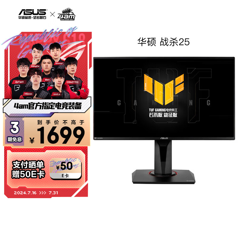 华硕VG259QM战杀25 24.5英寸显示器电竞240Hz显示器超频280Hz FastIPS 1ms响应HDR400旋转升降音响价格:1749.00元!