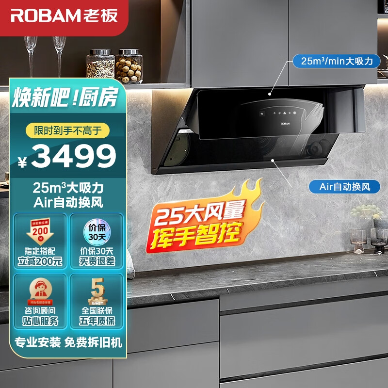 老板(Robam)抽油烟机探索家29A8CS变频侧吸式油烟机家用 25m3/min大风量低噪1000Pa挥手智控吸油烟机价格:3499.00元!