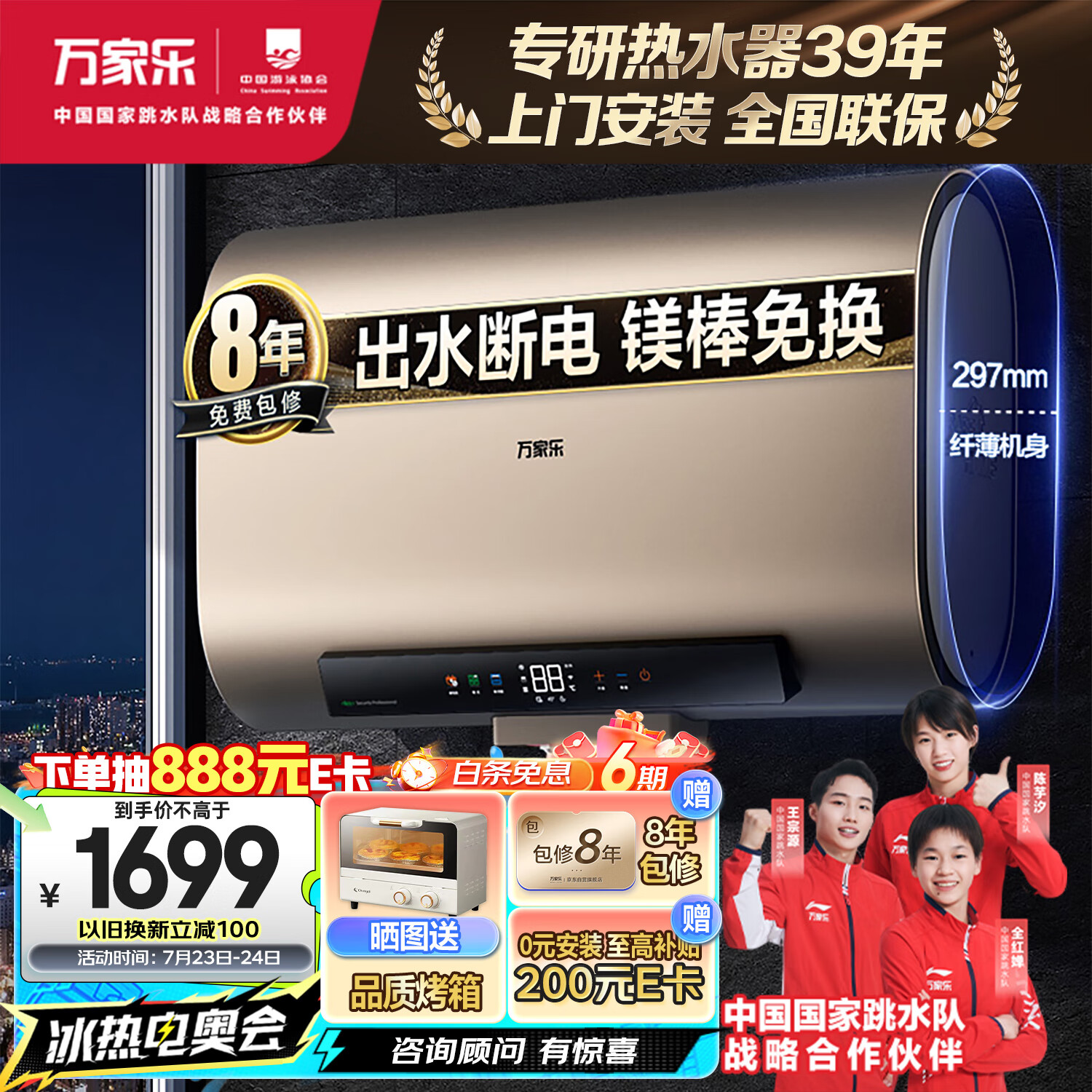 万家乐60升双胆扁桶电热水器3000W速热 镁棒免换 智能杀菌 出水断电 手机操控 一级能效D60-FB5 以旧换新价格:1799.00元!