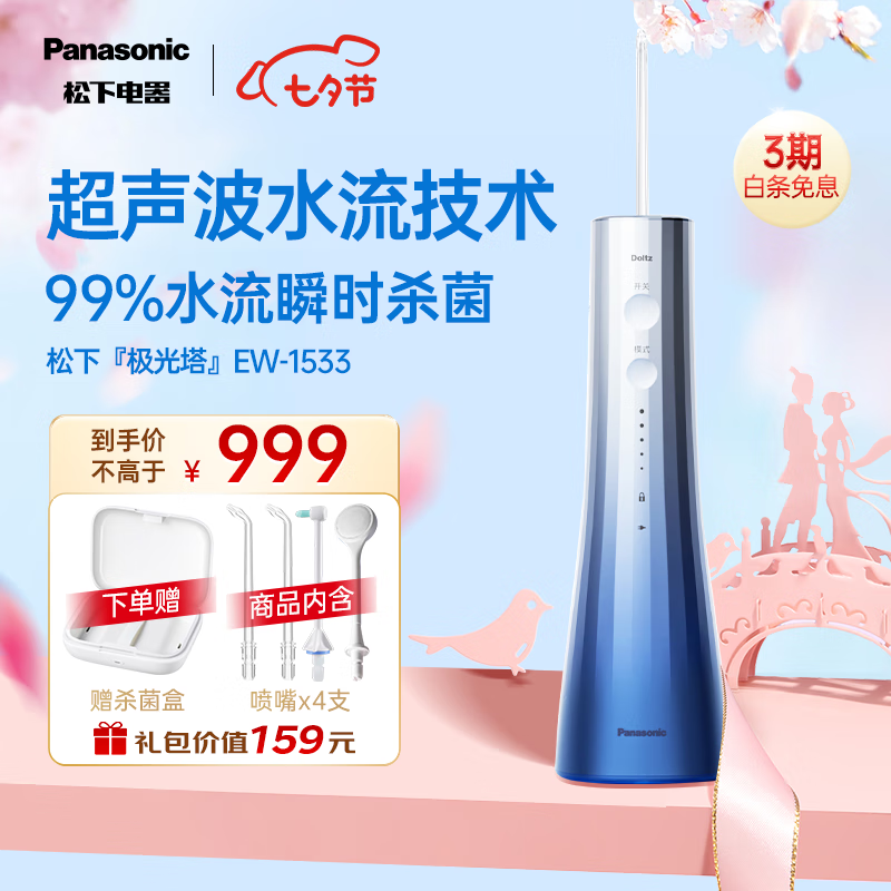 松下(Panasonic)冲牙器洗牙器超声波洁牙器立式便携水牙线水流瞬时杀菌 七夕情人节礼物送男友送女友极光塔1533价格:1119.00元!