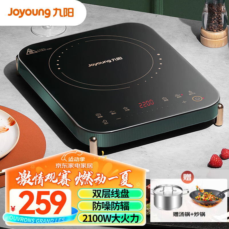 九阳(Joyoung)电磁炉套装家用电磁灶2100W一键爆炒防辐认证大火力爆炒定时功能C21S-C572配精铁炒锅欧式汤锅价格:259.00元!