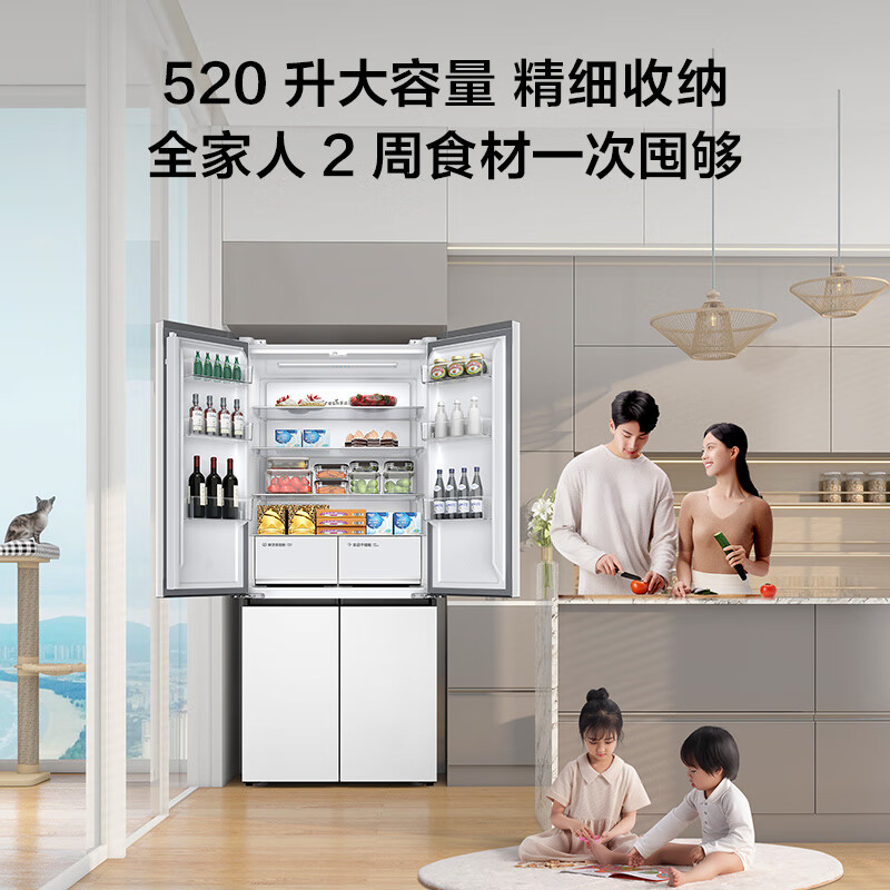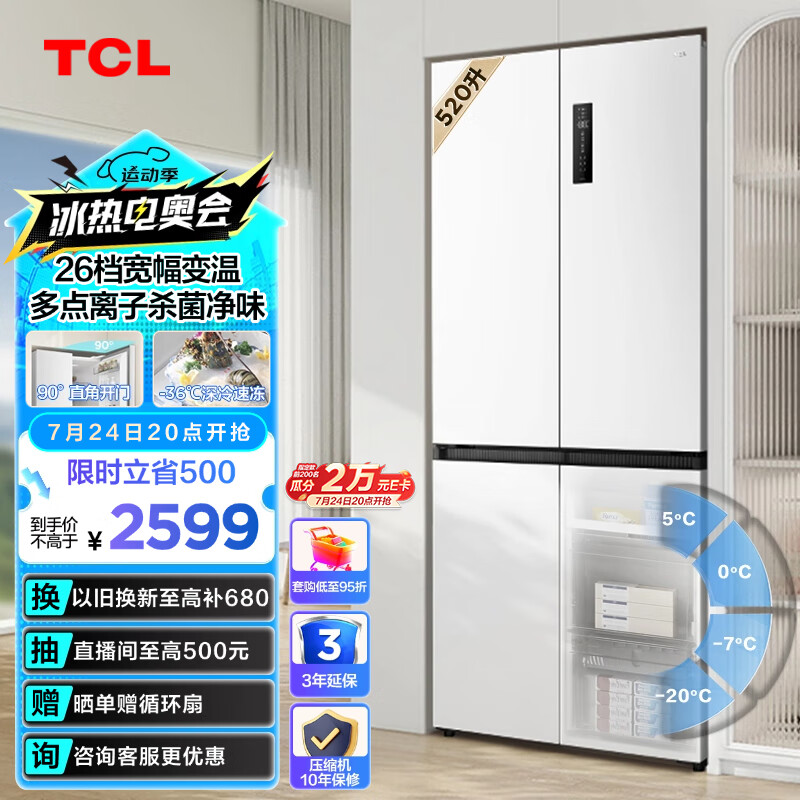 TCL 520升T5十字对开门超薄可嵌入大容量一级变频宽幅变温杀菌除味风冷无霜白色家用电冰箱R520T5-U价格:2899.00元!