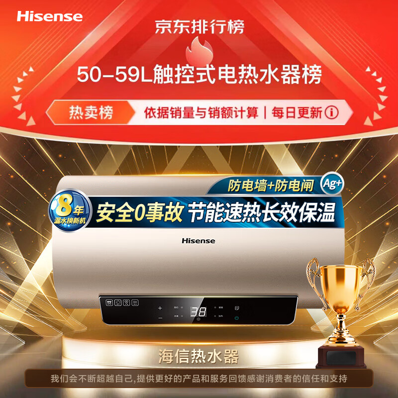 海信(Hisense)50升家用电热水器2100W速热5.5倍增容大屏触控自清洁智能预约双重防电保护DC50-W1513T以旧换新价格:579.00元!