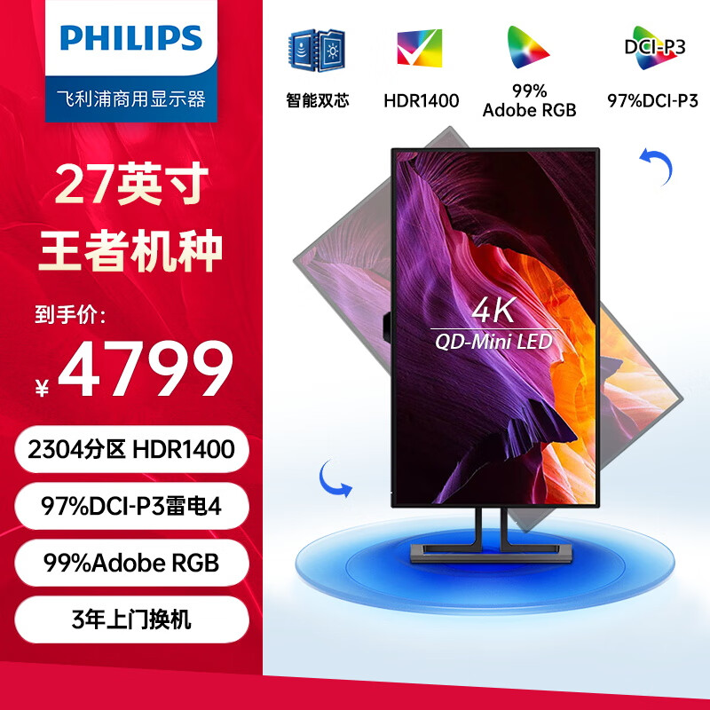 飞利浦(PHILIPS)27英寸 MiniLED显示器 99%Adobe RGB 4K量子点 2304分区 HDR1400 雷电4 智能双芯 27B1U7903价格:6999.00元!