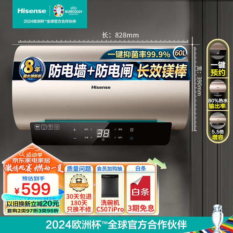 海信(Hisense)60升电热水器家用速热5.5倍增容健康灭菌长效镁棒大屏触控节能省电多重保障DC60-W1513T价格:599.00元!