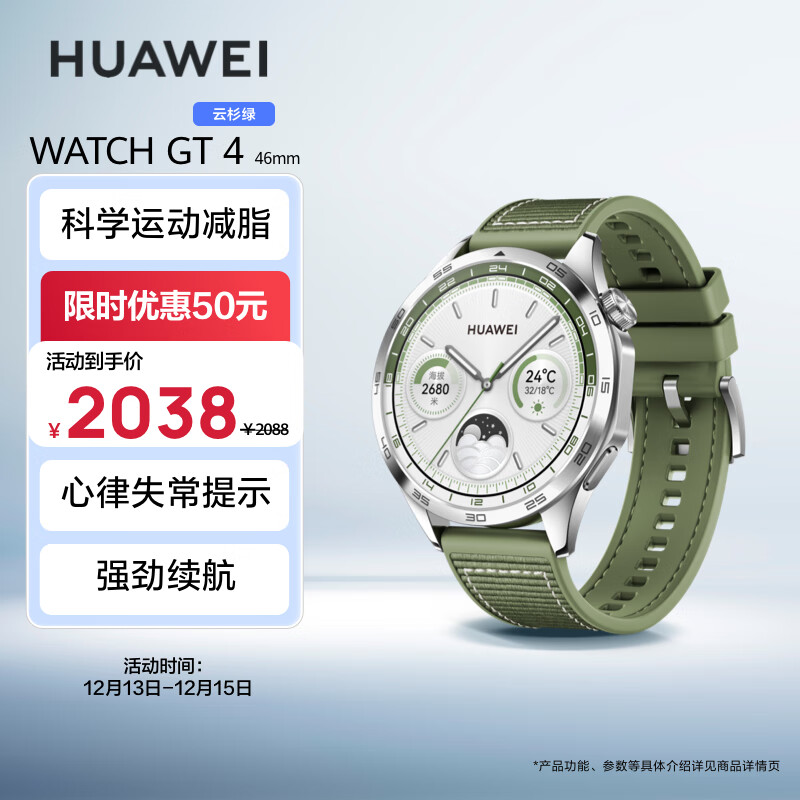 华为 HUAWEI WATCH GT 4 46mm 云杉绿 绿色复合编织表带价格:2038.00元!
