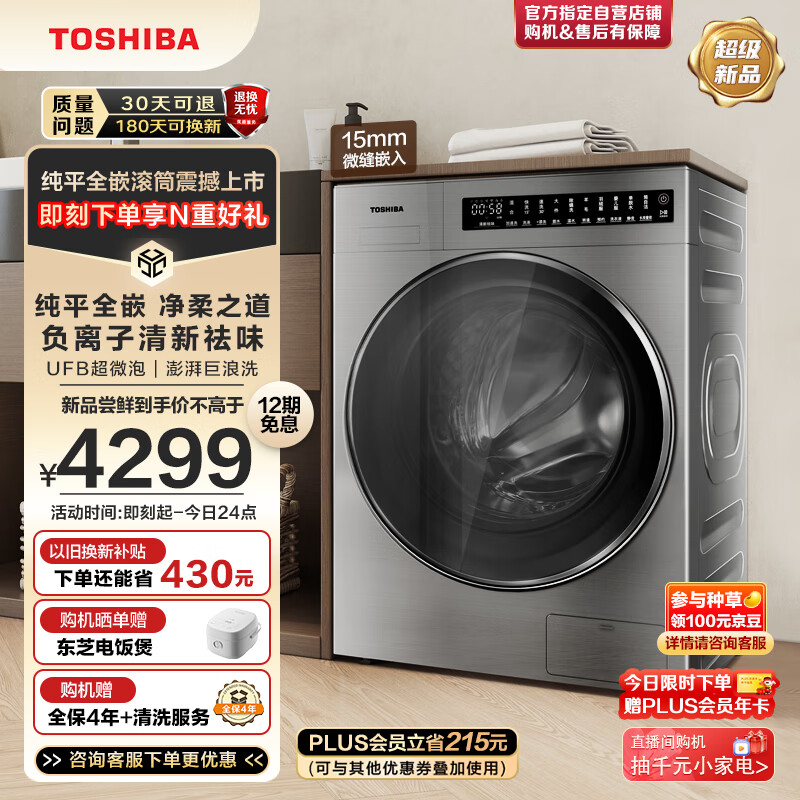 东芝(TOSHIBA)滚筒洗衣机全自动 10公斤大容量 纯平全嵌 智能投放 银离子除菌 【白珍珠线上款】DG-10TC22BYV价格:4299.00元!