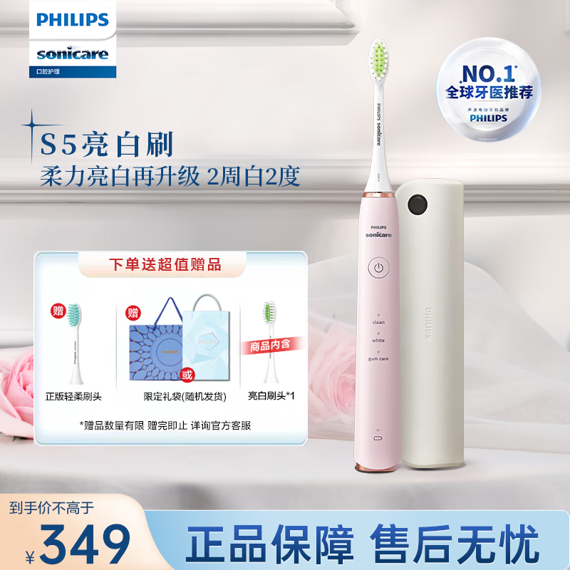 飞利浦(PHILIPS)电动牙刷S5 成人七夕礼物送男/女友生日礼物 亮白刷带紫外线杀菌盒HX2461/04蔷薇粉价格:379.00元!