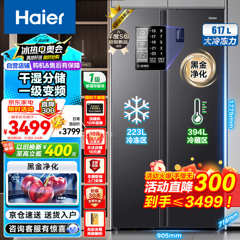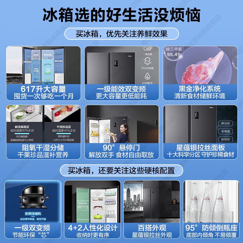海尔冰箱617升双开门对开门一级能效变频风冷无霜节能保鲜黑金净化家用大容量阻氧干湿分储电冰箱价格:3799.00元!