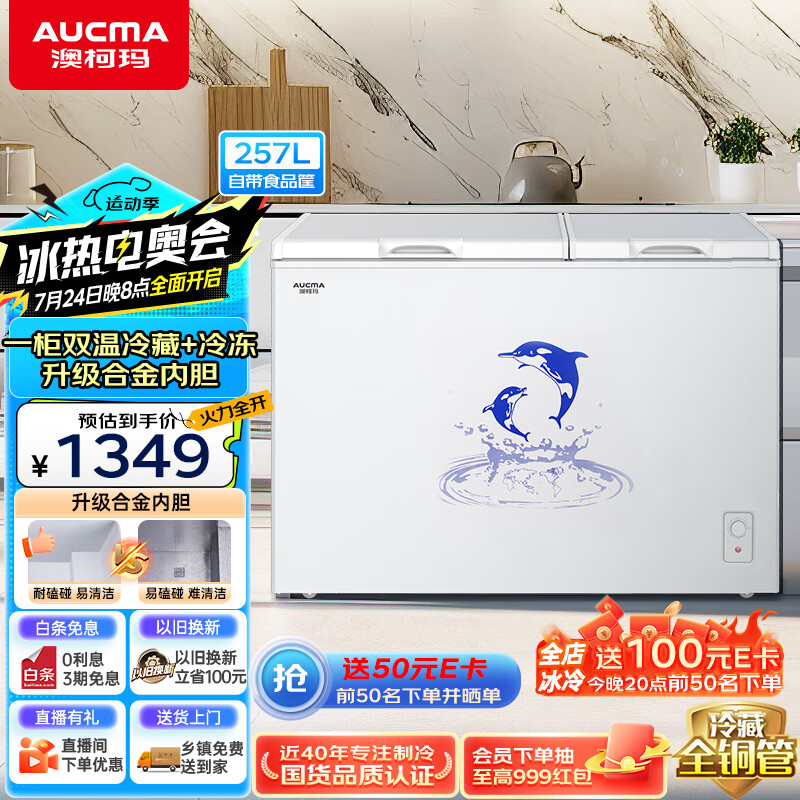 澳柯玛(AUCMA)257升低霜家用商用冰柜 大冷冻小冷藏卧式双温冰柜 小型冰箱冷柜 一级能效 BCD-257CHN以旧换新价格:1379.00元!
