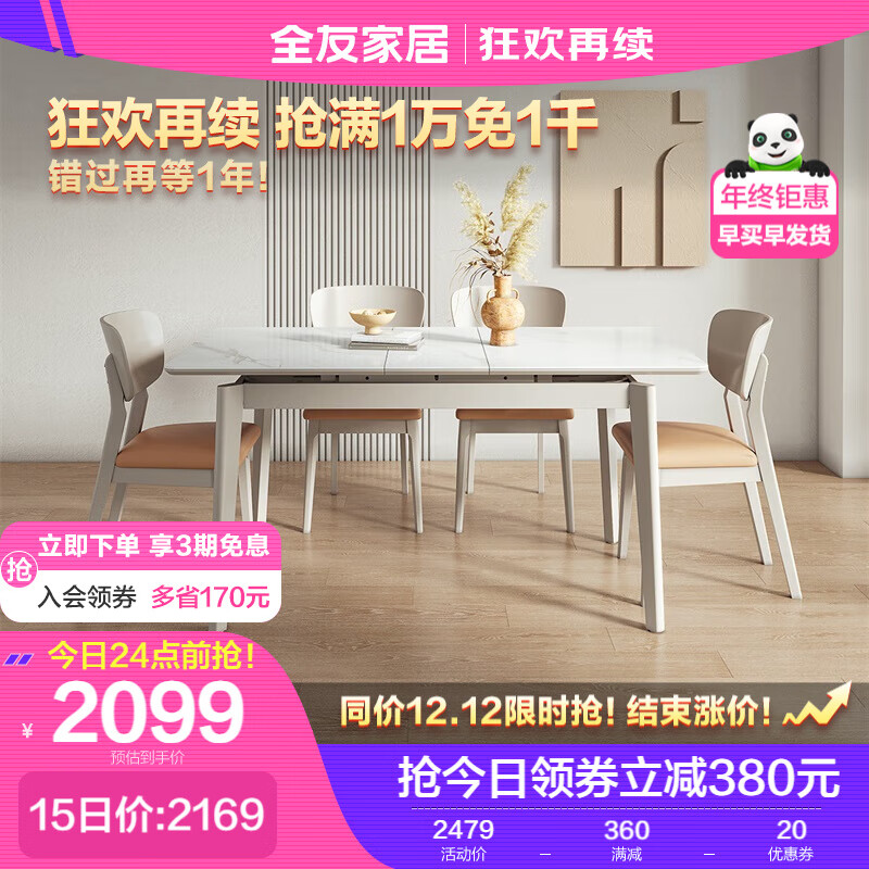 全友家居 餐桌现代简约岩板餐桌长短伸缩功能餐桌长方形桌子DW1120价格:2479.00元!