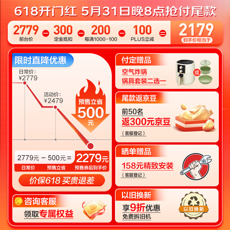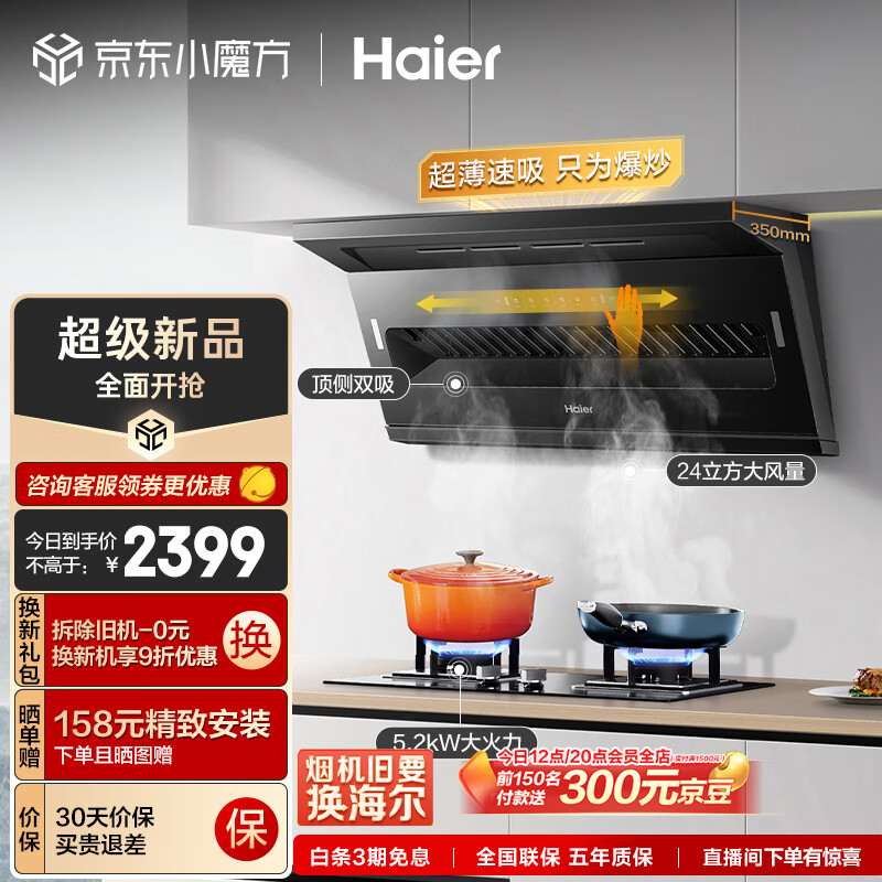 海尔(Haier)抽油烟机顶侧双吸 24m3/min大吸力 挥手智控 家用厨房吸油烟机天然气灶套装 齐平橱柜C51+Q2BE3价格:2399.00元!