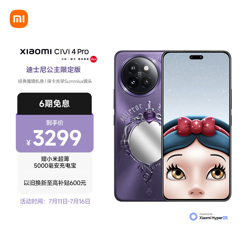 小米Civi 4 Pro 迪士尼公主限定版 5000万徕卡专业人像镜头 12GB+512GB 5g手机 第三代骁龙8s价格:3299.00元!
