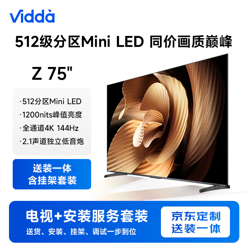 Vidda Z75【送装一体版】海信 75英寸 512分区Mini LED 144Hz 服务套装 送货 安装 挂架 调试一步到位价格:4699.00元!