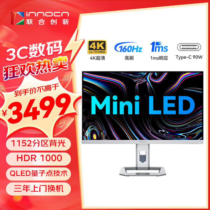 联合创新(INNOCN)27英寸4K 160Hz MiniLED显示器1ms自动感光护眼Type-C90W旋转升降HDR1000电脑显示屏27M2V价格:3999.00元!