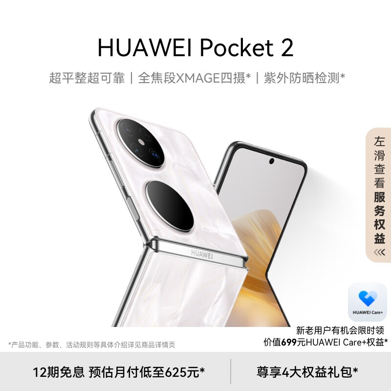 HUAWEI Pocket 2 超平整超可靠 全焦段XMAGE四摄 12GB+256GB 洛可可白 华为折叠屏鸿蒙手机价格:7499.00元!