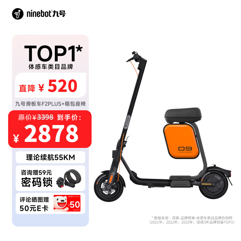 Ninebot九号电动滑板车F2plus+多功能座椅带箱包 成人学生便携智能可折叠电动车果冻胎体感车价格:2878.00元!