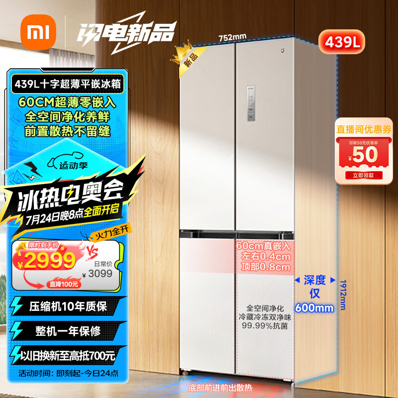 米家小米439升十字对开四开门家用电冰箱 60cm超薄零嵌入平嵌底部前置散热澎湃智联 BCD-439WMBI价格:2999.00元!