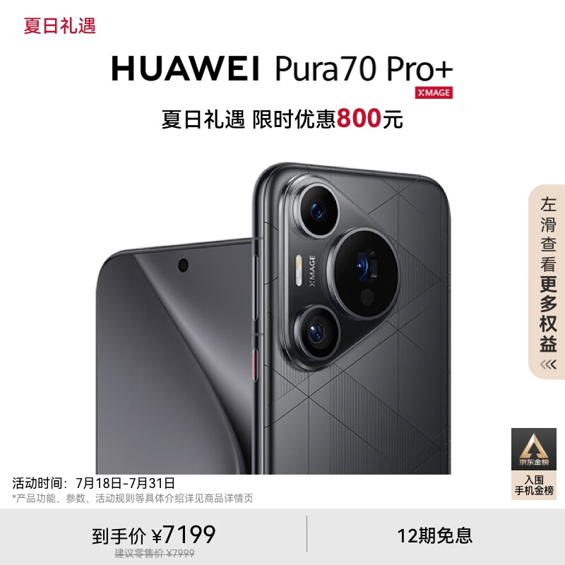 HUAWEI Pura 70 Pro+ 魅影黑 16GB+512GB 超高速风驰闪拍 超聚光微距长焦 双卫星通信 华为P70智能手机价格:7199.00元!