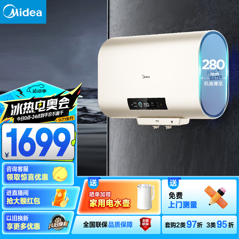 美的(Midea)玲珑50升超薄双胆扁桶电热水器3200W变频 免换镁棒出水断电浴室防摔一键呼救F5032-CA7(HY) 美颐享价格:1799.00元!