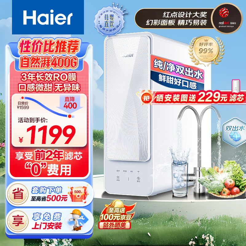 海尔(Haier)自然湃家用净水器400G净水机 RO反渗透过滤双出水厨下自来水过滤直饮纯水机 HRO4H88价格:1199.00元!