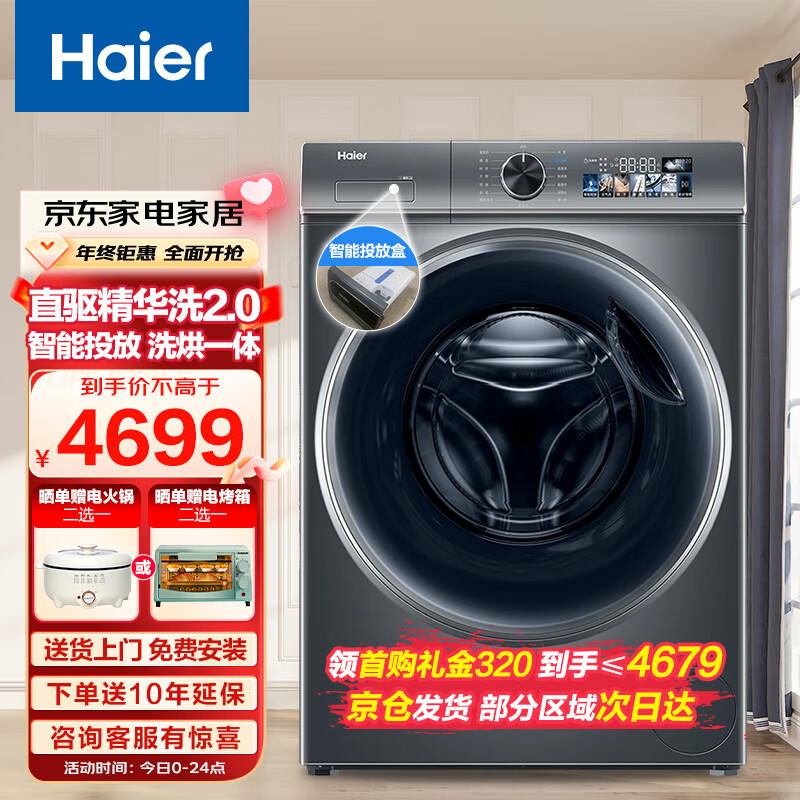 海尔(Haier)【精华洗2.0】10KG滚筒洗衣机全自动直驱变频一级能效智能投放空气洗烘一体XQG100-HBD1266[家电]价格:4999.00元!