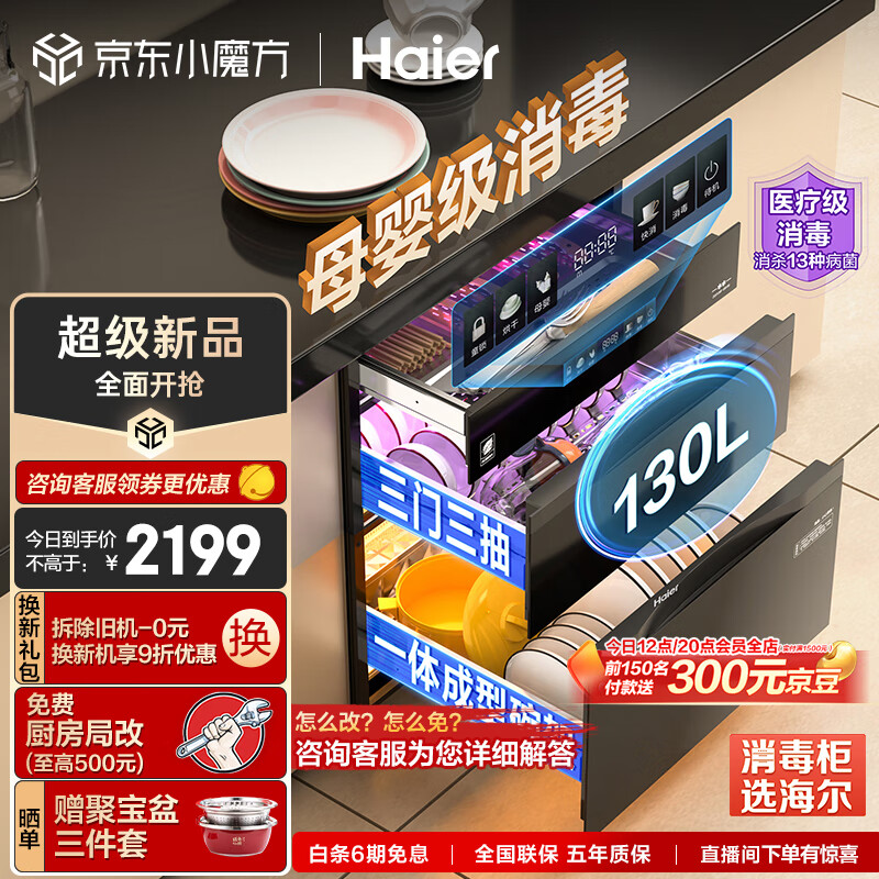 海尔(Haier)消毒柜嵌入式 130L三门三抽大容量 家用消毒碗柜 紫外线+光波巴氏消毒新升级 婴儿奶瓶EB130价格:2199.00元!