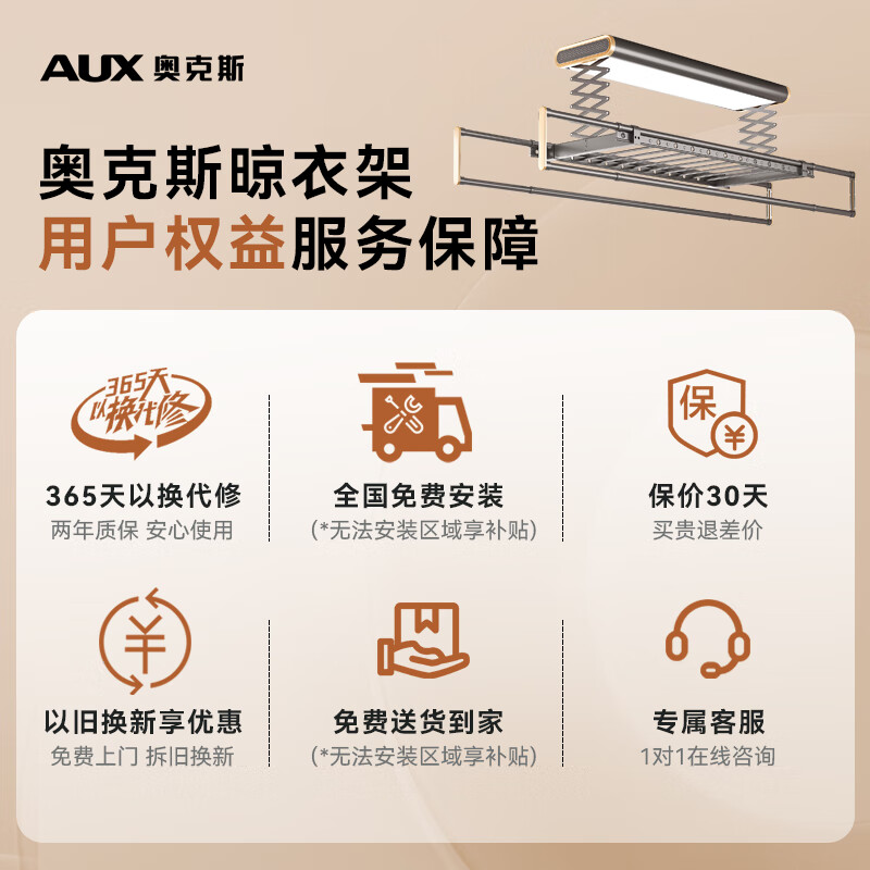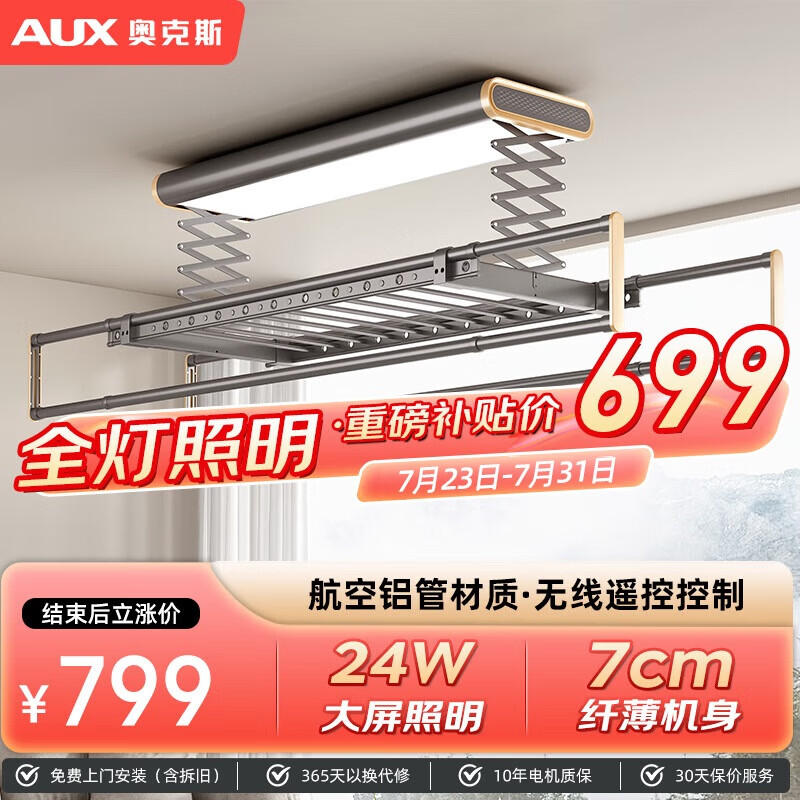 奥克斯(AUX)电动晾衣架升级款自动升降杆阳台室外四杆伸缩遥控LED照明灰EH802价格:799.00元!