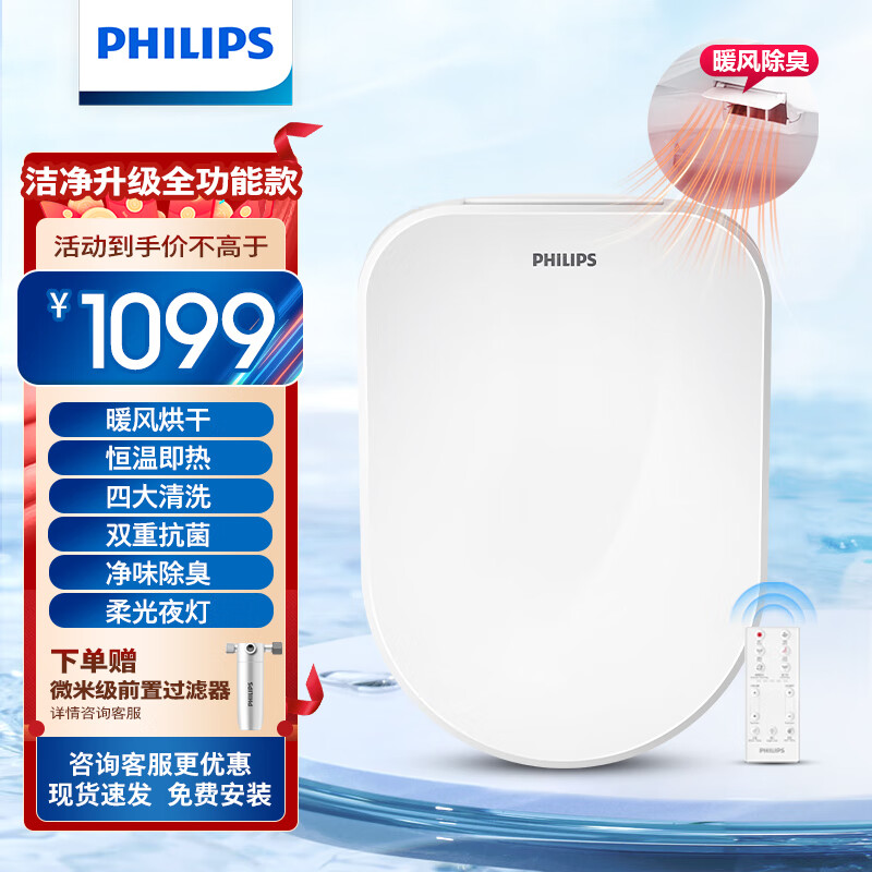 飞利浦(PHILIPS)智能马桶盖 恒温暖风烘干即热冲洗恒温净味抗菌自洁坐便盖AIB2255价格:1187.30元!