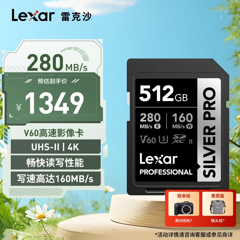 雷克沙(Lexar)512GB SD存储卡 C10 U3 V60 4K相机内存卡 读280MB/s 写160MB/s 捕捉光影(SILVER PRO) 价格:1349.00元!