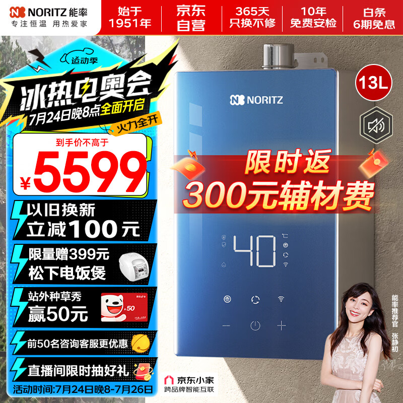 能率(NORITZ)零冷水燃气热水器13升 水量伺服器 双智控屏玻璃面板 GQ-13EX6AFEXQ(JSQ25-EX6AQ)天然气价格:5587.80元!