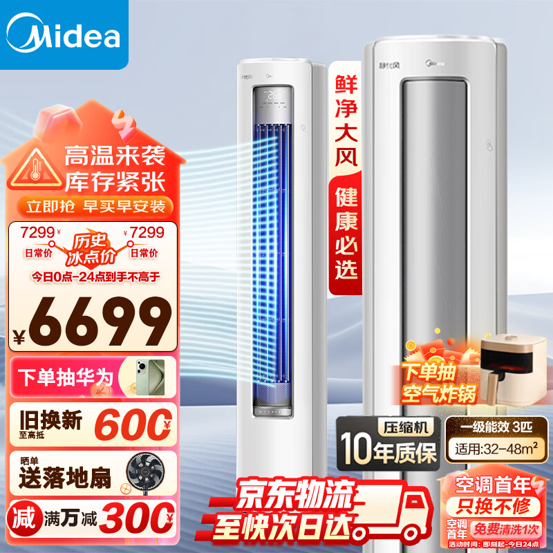 美的(Midea)空调 3匹 静优风 新一级能效 变频冷暖 除湿 空调立式 客厅空调立式柜机 KFR-72LW/N8HY1-1价格:6699.00元!
