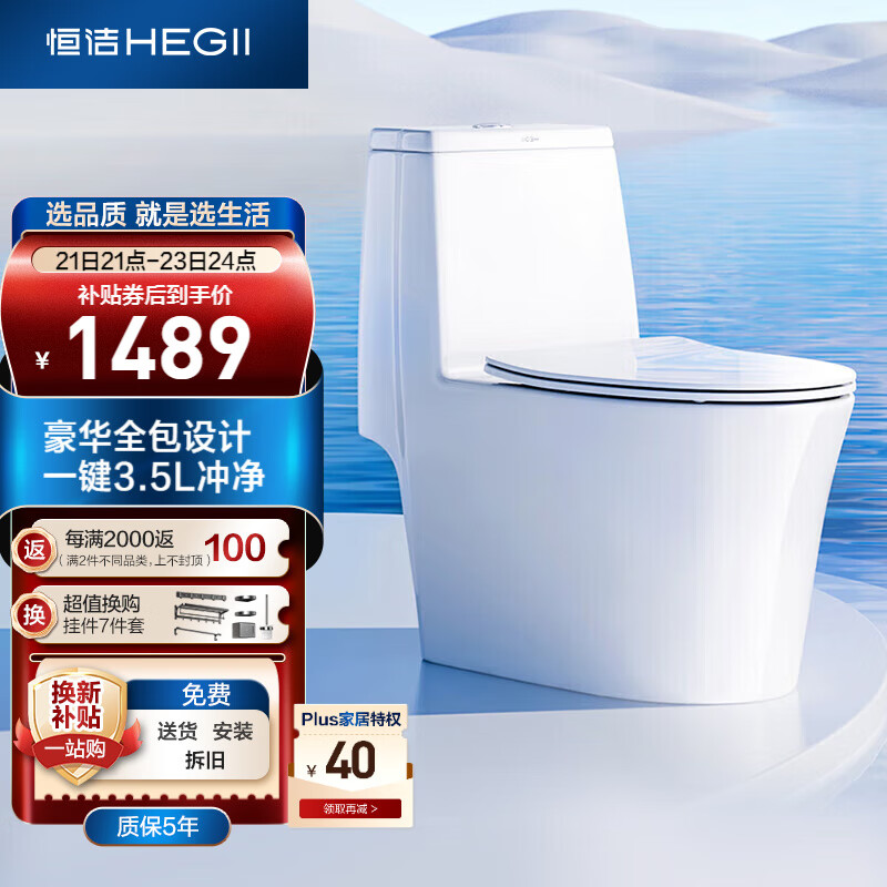 恒洁(HEGII)马桶143 超旋风大冲力一键速冲除污连体坐便器HC0143DT-305价格:1849.00元!