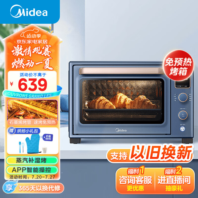 美的(Midea)35L免预热家用多功能电烤箱石墨烯烤箱初见Q30系列 搪瓷内胆/蒸汽补湿/精准控温/APP智控PT3535W价格:719.00元!