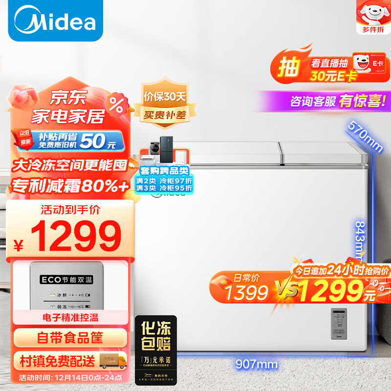 美的(Midea)210升双温双箱家商两用冰柜 大冷冻小冷藏卧式顶开门冰柜 小型冰箱节能低音冷柜BCD-210DKEM(E)价格:1399.00元!