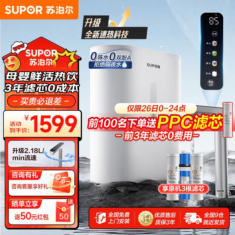苏泊尔(SUPOR)600G即热零陈水反渗透净水器 加热直饮一体机 家用净水机厨下式 即开即热 智能触控屏精准调温DH01价格:1599.00元!