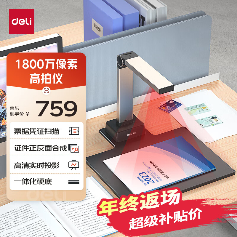 得力(deli)扫描仪 1800万像素高拍仪 照片扫描仪 扫描仪自动连续 高速办公用 文件证件扫描 一体化硬底15159价格:879.00元!