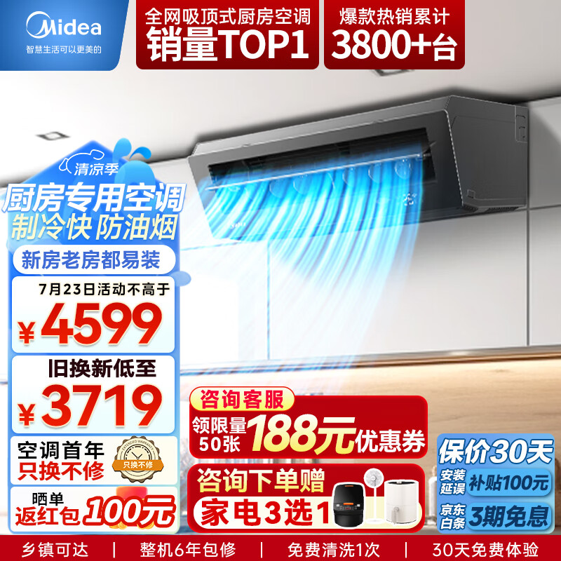 美的(Midea)小凉方 厨房空调 专用吸顶式 1.5匹变频 防油烟 大冷量 易安装CKF-35XW/BN8Y-XD200【包安装】价格:4599.00元!