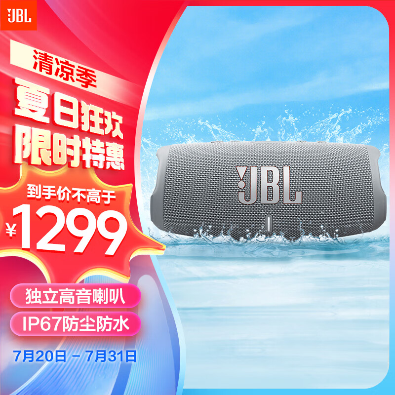 JBL CHARGE5 音乐冲击波五代 便携式蓝牙音箱+低音炮 户外防水防尘 桌面音响 增强版赛道扬声器 灰色价格:1499.00元!