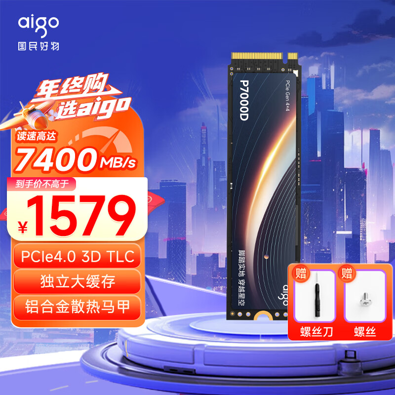 爱国者 (aigo)4TB SSD固态硬盘 M.2接口(NVMe协议PCIe4.0x4)长江存储晶圆P7000D 读速7400MB/s PS5笔记本适用价格:1579.00元!