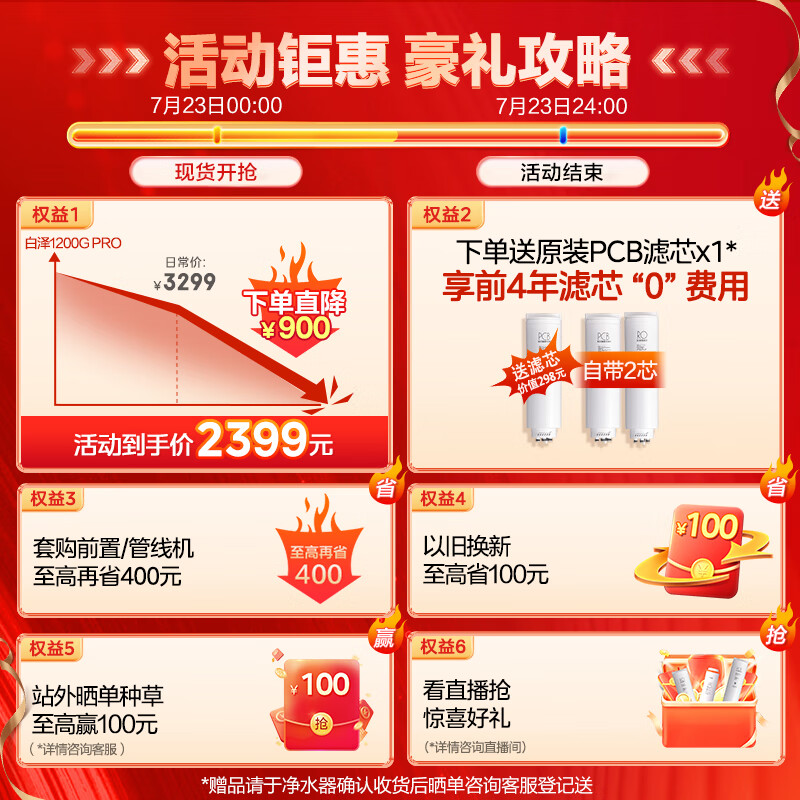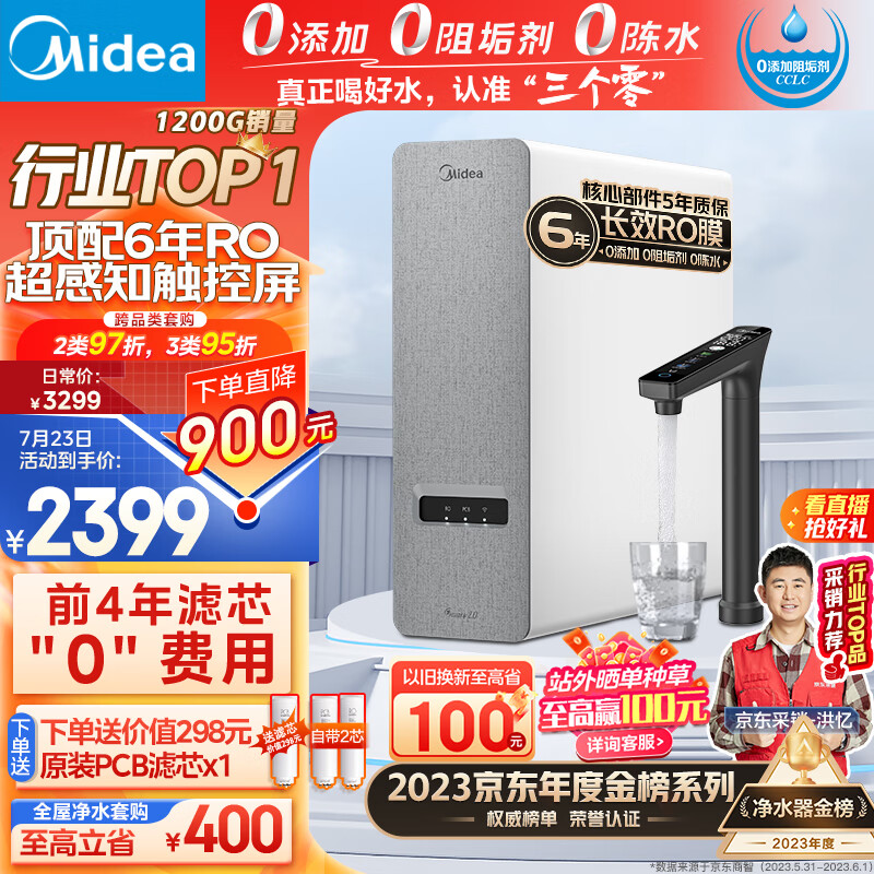 美的(Midea)净水器家用净水机白泽1200G pro 云朵系列 6年RO反渗透厨下式直饮净水器鲜活零陈水双出水3.15L/分价格:2399.00元!