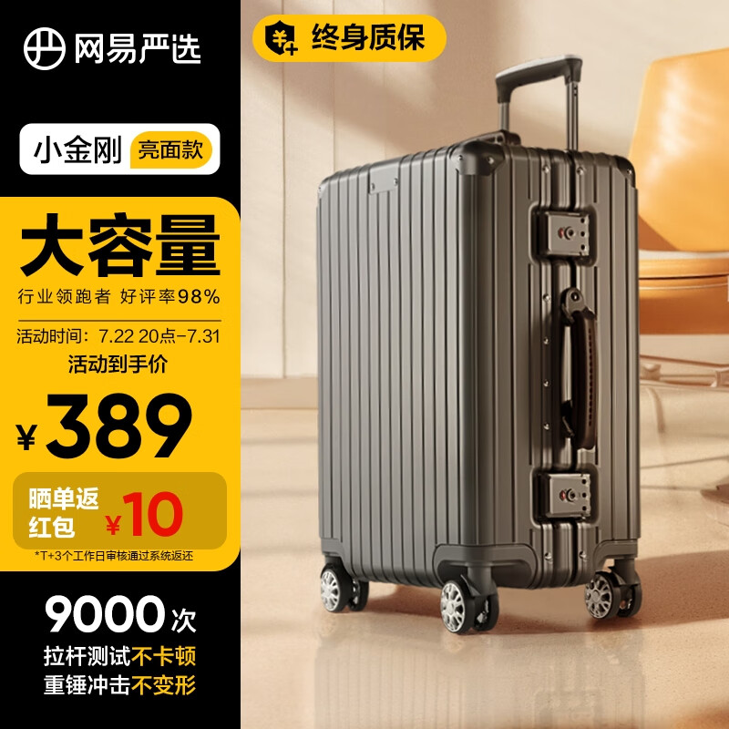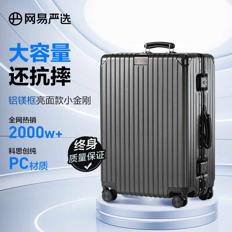 网易严选大容量铝镁框小金刚PC行李箱商务学生拉杆箱升级20英寸亮面深灰色价格:429.00元!