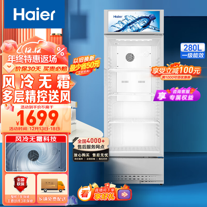 海尔(Haier) 280升风冷无霜立式展示柜冰柜 饮料冷藏柜商用保鲜柜冷柜SC-288DS 以旧换新价格:1799.00元!