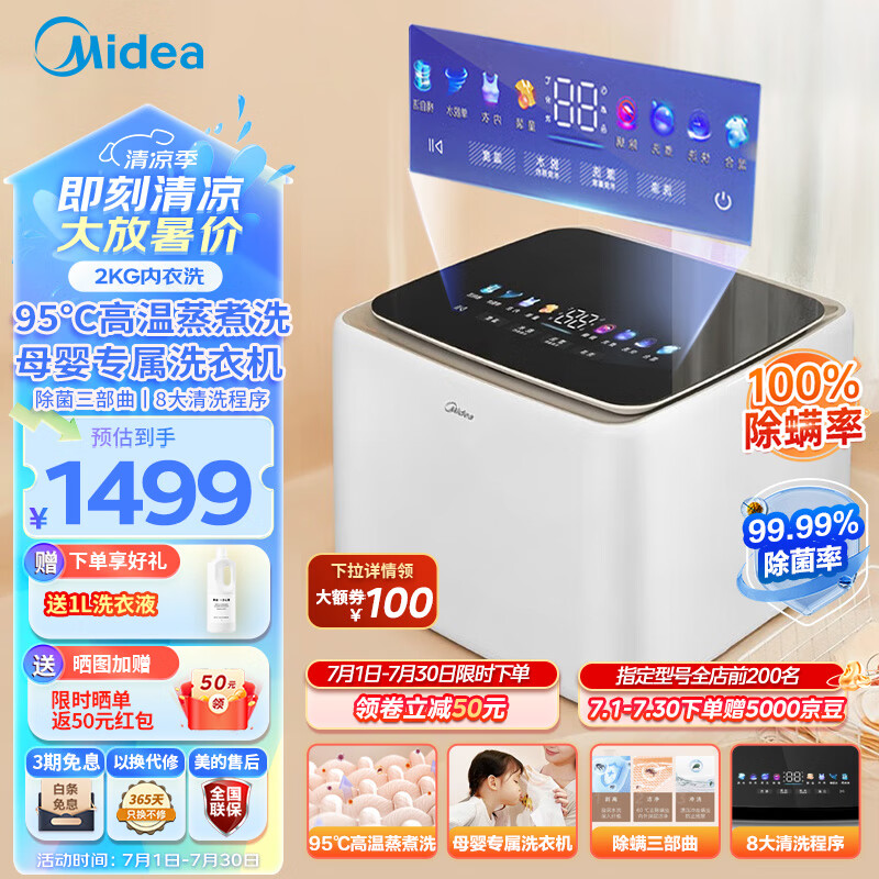 美的(Midea)内衣洗衣机2KG全自动波轮 迷你内裤洗衣机小型高温蒸煮洗除菌净螨儿童婴儿内衣裤洗衣机MNB20-01W价格:1499.00元!